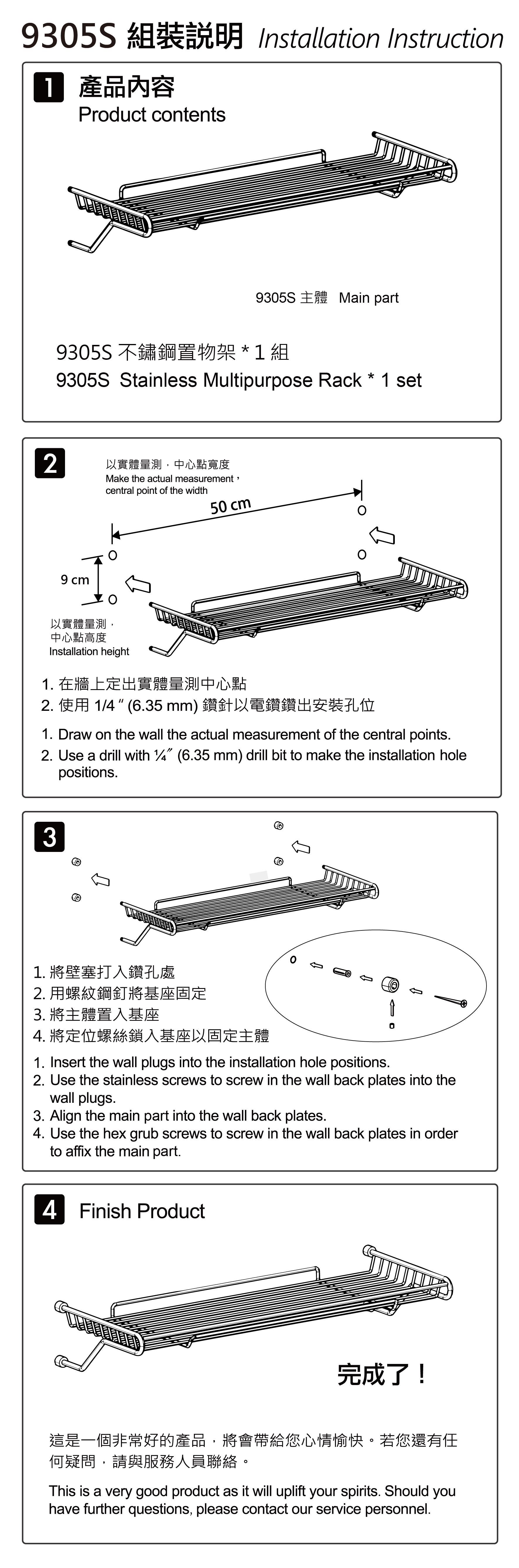 | 內部配件: | 不鏽鋼置物毛巾架 (52.8 公分) * 1 、 不鏽鋼接頭 * 4 、不鏽鋼螺絲 * 4 、不鏽鋼固定螺絲 * 6 、壁塞 * 4 、六角板手 * 1 |